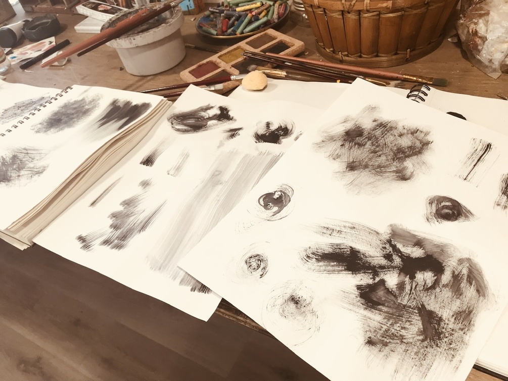 These 50 brushes were made using a variety of mediums such as charcoal, gouache, soft pastels, oil pastels, tissue paper, and water soluble graphite. Applied using brushes, sponges, cloth, and a tooth brush.